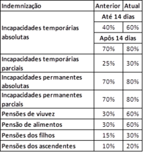 - A alteração mais significativa e com maior impacto nos segurados e/ou beneficiários prende-se com a mudança na determinação do valor do limite máximo do salário seguro mensal, tendo em conta que a anterior legislação não abrangia o salário efetivo do trabalhador, pois tinha por referência um capital de 300 ECV diários, ou seja, 9.000 ECV para 30 dias de trabalho. Por outro lado, há um aumento das prestações de indemnizações em dinheiro, através do aumento das percentagens que incidem sobre a remuneração de base, evidenciado no quadro que se segue.