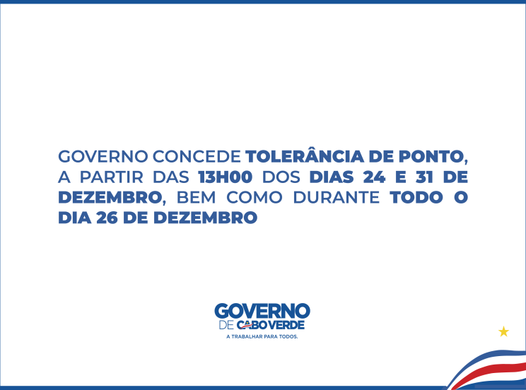 O Governo aprovou uma Resolução que concede tolerância de ponto, a todos os funcionários e agentes do Estado, dos institutos públicos e das autarquias locais, em todo o território nacional, a partir das 13h00 dos dias 24 e 31 de dezembro, bem como durante todo o dia 26 de dezembro.