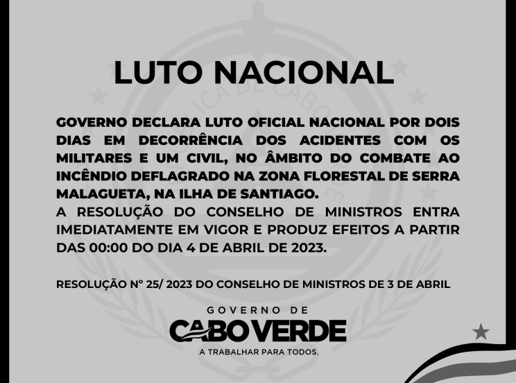 É com este estado de espírito que o Governo, em consonância com o sentimento generalizado de tristeza de todo o povo cabo-verdiano, declara, com profundo sentido de pesar e solidariedade às famílias e à instituição das Forças Armadas, este luto oficial por dois dias.