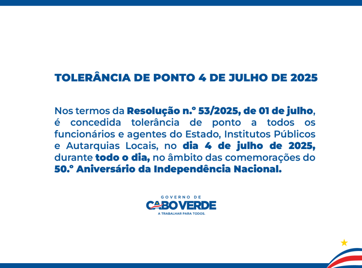 O Conselho de Ministros concedeu tolerância de ponto a todos os funcionários e agentes do Estado, dos Institutos Públicos e das Autarquias Locais, para o dia 4 de julho de 2025 (sexta-feira), véspera do 50.º Aniversário da Independência Nacional.